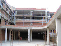La empresa Macro se instaló en el pueblo durante 10-12 meses para trabajar en distintos aspectos, como podemos ver en la fotografías, algunos de ellos fueron la tirada del edificio principal, el aplanamiento de arena del parking, y la construcción del nuevo edificio.